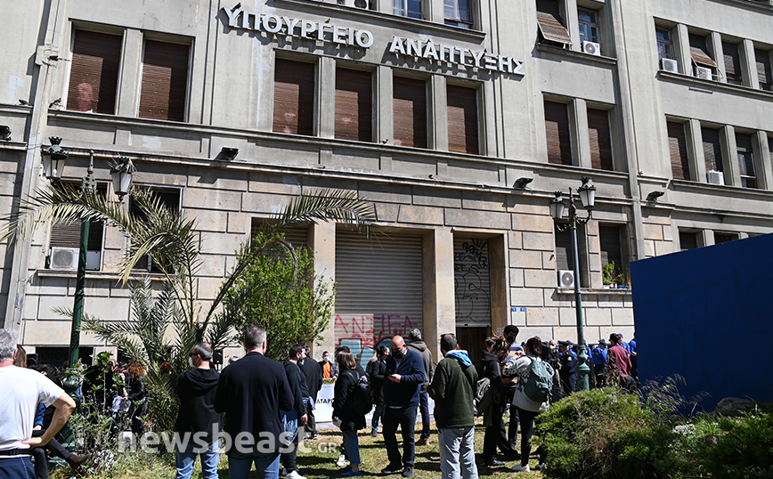 Στο κτίριο του υπουργείου αναρτήθηκε ένα μεγάλο πανό, το οποίο υπογράφει η Ομοσπονδία Υπουργείου Ανάπτυξης (ΟΣΥΒΕΤ) Σύλλογος Υπαλλήλων Τέως Υπουργείου Ανάπτυξης Τομείς Βιομηχανίας και Ενέργεια.