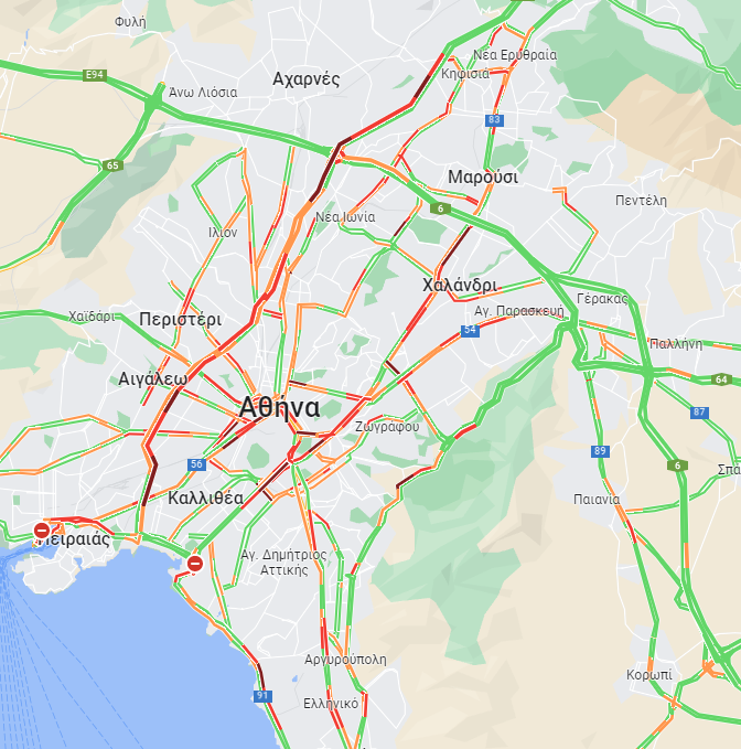 Συγκεκριμένα στο κόκκινο είναι η κυκλοφορία στην κάθοδο του Κηφισού από το ύψος της Κηφισιάς έως και τη Μεταμόρφωση, ενώ προβλήματα αντιμετωπίζουν οι οδηγοί και στην άνοδο από το Μοσχάτο έως το Περιστέρι.