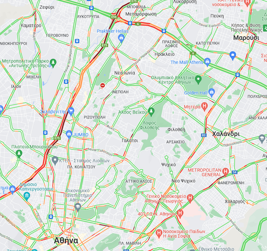 Στο κόκκινο βρίσκονται αρκετοί κεντρικοί δρόμοι στην Αττική το πρωί της Μεγάλης Δευτέρας. Προβλήματα υπάρχουν στον Κηφισό, καθώς και καθυστερήσεις στην Αττική Οδό.