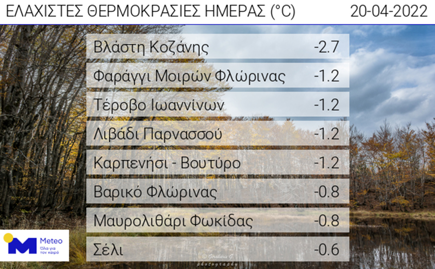 Η χαμηλότερη ελάχιστη θερμοκρασία καταγράφηκε στη Βλάστη Κοζάνης με -2,7 βαθμούς Κελσίου. Σύμφωνα με το δίκτυο των αυτόματων μετεωρολογικών σταθμών του Εθνικού Αστεροσκοπείου Αθηνών/meteo.gr οι επόμενες χαμηλότερες ελάχιστες θερμοκρασίες κατά τις πρωινές ώρες της Μεγάλης Τετάρτης σημειώθηκαν σε Φαράγγι Μοιρών Φλώρινας (-1,2), Τέροβο Ιωαννίνων (-1,2), Λιβάδι Παρνασσού (-1,2) και Βουτύρο Καρπενησίου (-1,2 βαθμοί).