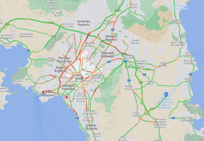 Σύμφωνα με τους χάρτες του Google maps, έχει «φρακάρει» ο δρόμος προς το λιμάνι του Πειραιά, ενώ αυξημένη είναι η κίνηση προς την Αττική Οδό, η οποία ενημερώνει τους οδηγούς ότι υπάρχουν καθυστερήσεις 5-10 λεπτών από τον κόμβο Πεντέλης έως τον κόμβο Κηφισίας, στο ρεύμα προς Ελευσίνα.