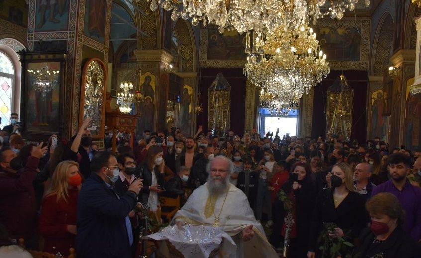 Με λαμπρότητα τελέστηκε στην Χίο η πρώτη Ανάσταση, με εκατοντάδες πιστούς να κατακλύζουν τον Ιερό Ναό της Παναγίας Ευαγγελιστρίας, τηρώντας τα μέτρα για τον κορονοϊό.