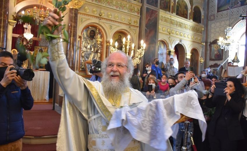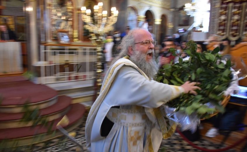 Ο γνωστός κι ως «ιπτάμενος ιερέας» σκόρπισε με το δικό του ξεχωριστό τρόπο δαφνόφυλλα, σύμβολα της νίκης του Χριστού, την ώρα που οι πολυέλαιοι της εκκλησίας κουνήθηκαν -σαν από σεισμό- και οι πιστοί χτύπησαν τις πάγκες, τα στασίδια, συμμετέχοντας με αυτό τον ιδιαίτερα ηχηρό τρόπο στη χαρμόσυνη είδηση της Ανάστασης του Κυρίου.