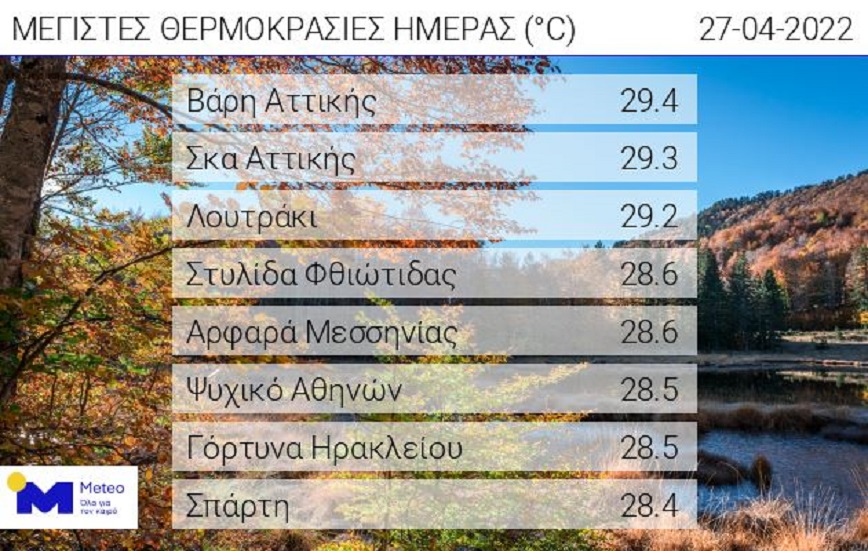 Την Τετάρτη του Πάσχα στην Αττική σημειώθηκε η υψηλότερη θερμοκρασία της ημέρας και συγκεκριμένα στην Βάρη όπου το θερμόμετρο έφτασε τους 29.4 βαθμούς Κελσίου, σύμφωνα με το Εθνικό Αστεροσκοπείο.