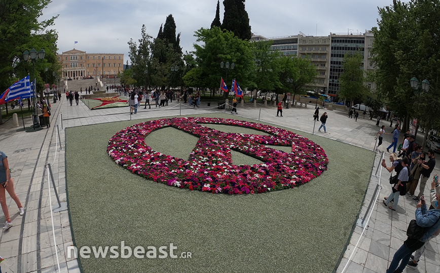 Την Εργατική Πρωτομαγιά γιορτάζει με τον δικό της τρόπο η Αθήνα. Στο κέντρο της πρωτεύουσας, πάνω στην πλατεία Συντάγματος έχει στηθεί ένα τεράστιο σήμα της Ειρήνης που έχει φτιαχτεί από λουλούδια.