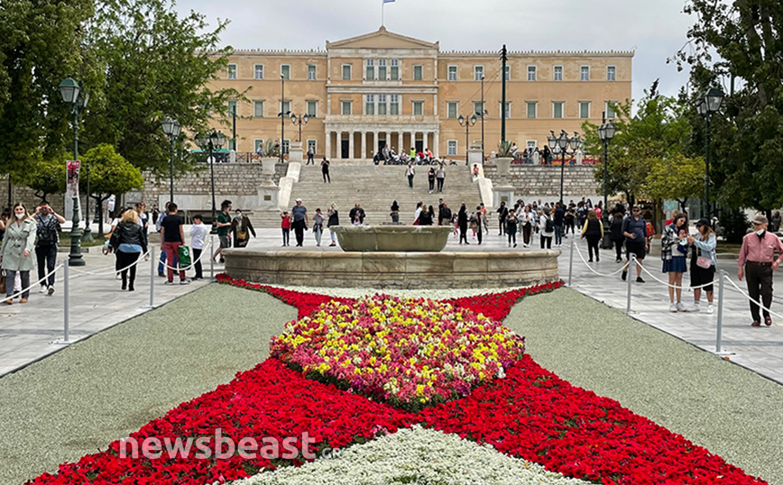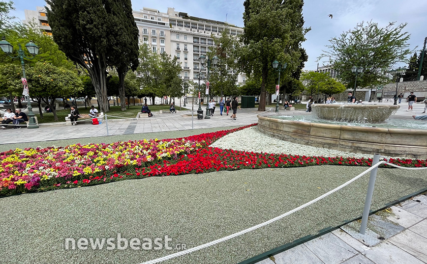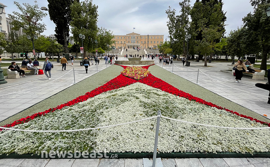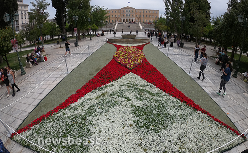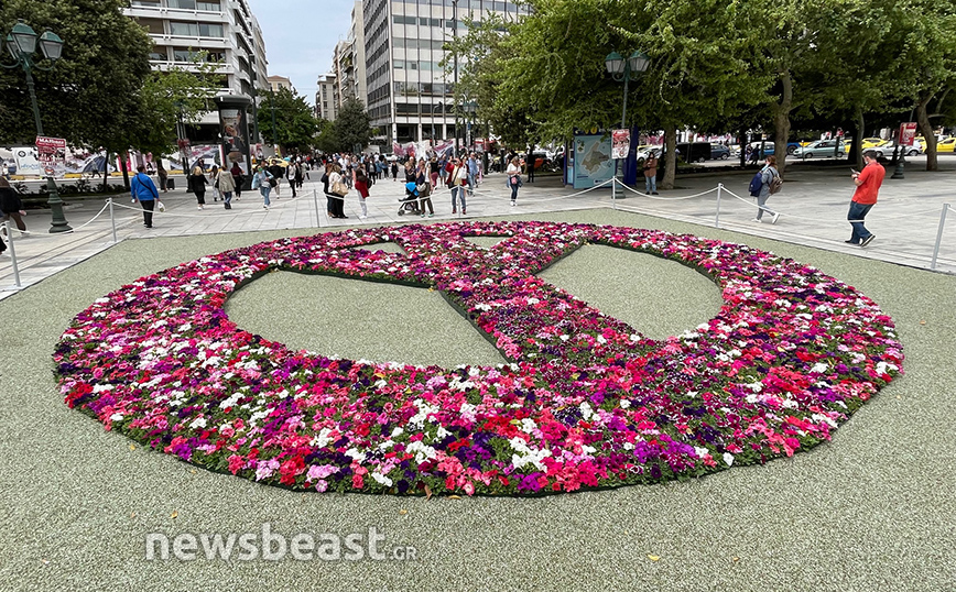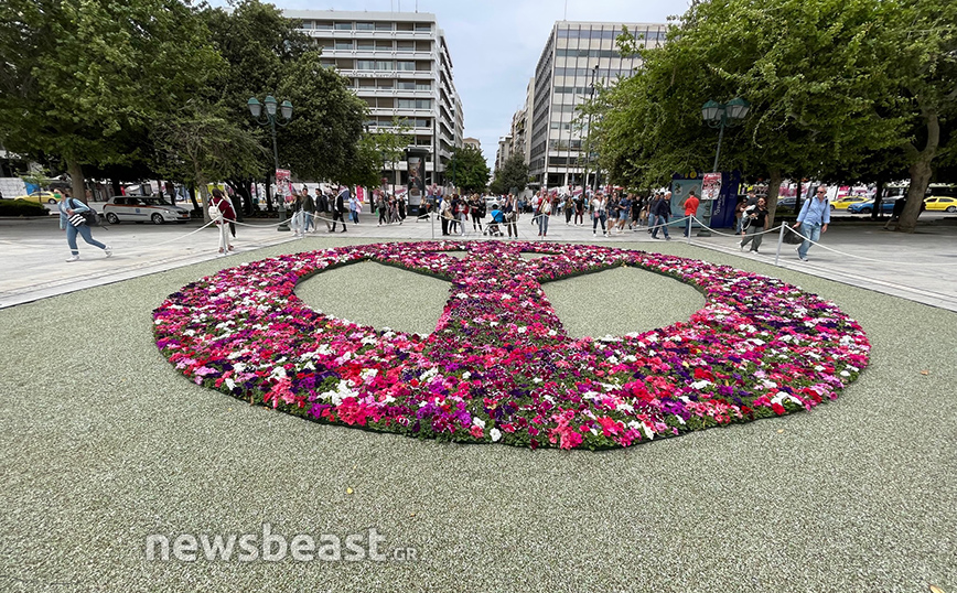 Το σήμα της Ειρήνης σε ροζ – μοβ αποχρώσεις αλλά και ο επίσης λουλουδάτος διάδρομος σε κόκκινο και κίτρινο χρώμα που βρίσκεται μπροστά από το συντριβάνι της πλατείας στο Σύνταγμα φτιάχτηκαν μετά από πρωτοβουλία του δήμου Αθηναίων.