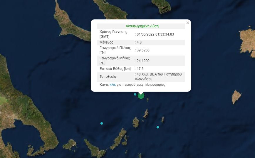 Σεισμός μεγέθους 4,3 βαθμών της κλίμακας Ρίχτερ σημειώθηκε στις 04:33 στα ανοικτά της Αλοννήσου, όπως ανακοίνωσε το Γεωδυναμικό Ινστιτούτο του Εθνικού Αστεροσκοπείου Αθηνών.