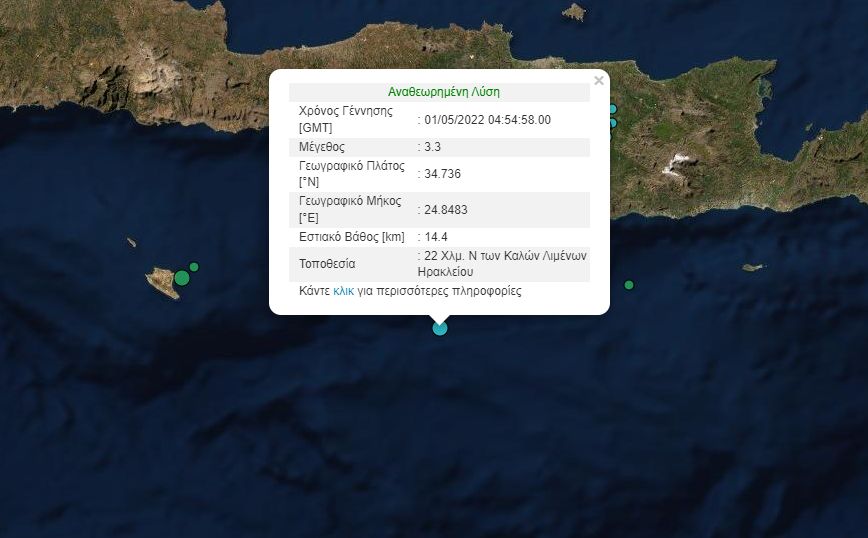 Σεισμική δόνηση μεγέθους 3,3 βαθμών της κλίμακας Ρίχτερ σημειώθηκε λίγο πριν τις 08:00 στη θαλάσσια περιοχή νότια του Ηρακλείου, σύμφωνα με το Γεωδυναμικό Ινστιτούτο του Εθνικού Αστεροσκοπείου Αθηνών.