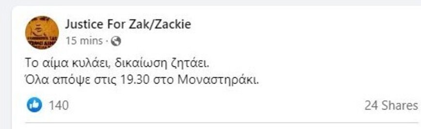 «Το αίμα κυλάει, δικαίωση ζητάει. Όλα απόψε στις 19:30 στο Μοναστηράκι» επισημαίνεται στην ανάρτηση που ανέβηκε στη σελίδα «Justice For Zak/Zackie» περίπου μία ώρα μετά την ανακοίνωση της απόφασης του δικαστήριου.