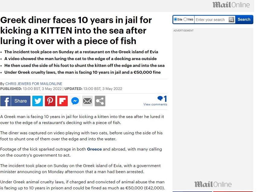 Σύμφωνα με το άρθρο που δημοσίευσε η dailymail.co.uk με τίτλο «Έλληνας αντιμετωπίζει 10 χρόνια φυλάκιση, επειδή κλώτσησε ένα γατάκι στη θάλασσα, αφού το παρέσυρε με ένα κομμάτι ψάρι», αναφέρει πως τα πλάνα με την κλωτσιά, προκάλεσαν οργή τόσο στην Ελλάδα όσο και στο εξωτερικό, με πολλούς να καλούν την κυβέρνηση της χώρας να δράσει.