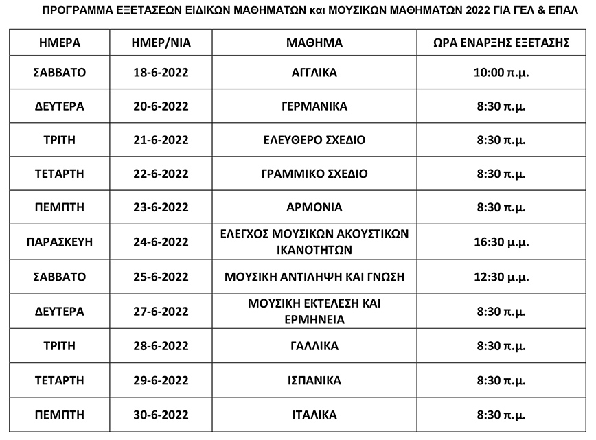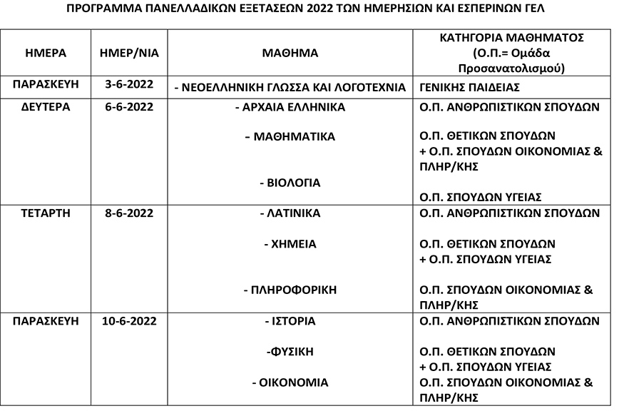 - Έναρξη πανελλαδικών εξετάσεων ημερήσιων και εσπερινών γενικών λυκείων: 3 Ιουνίου 2022