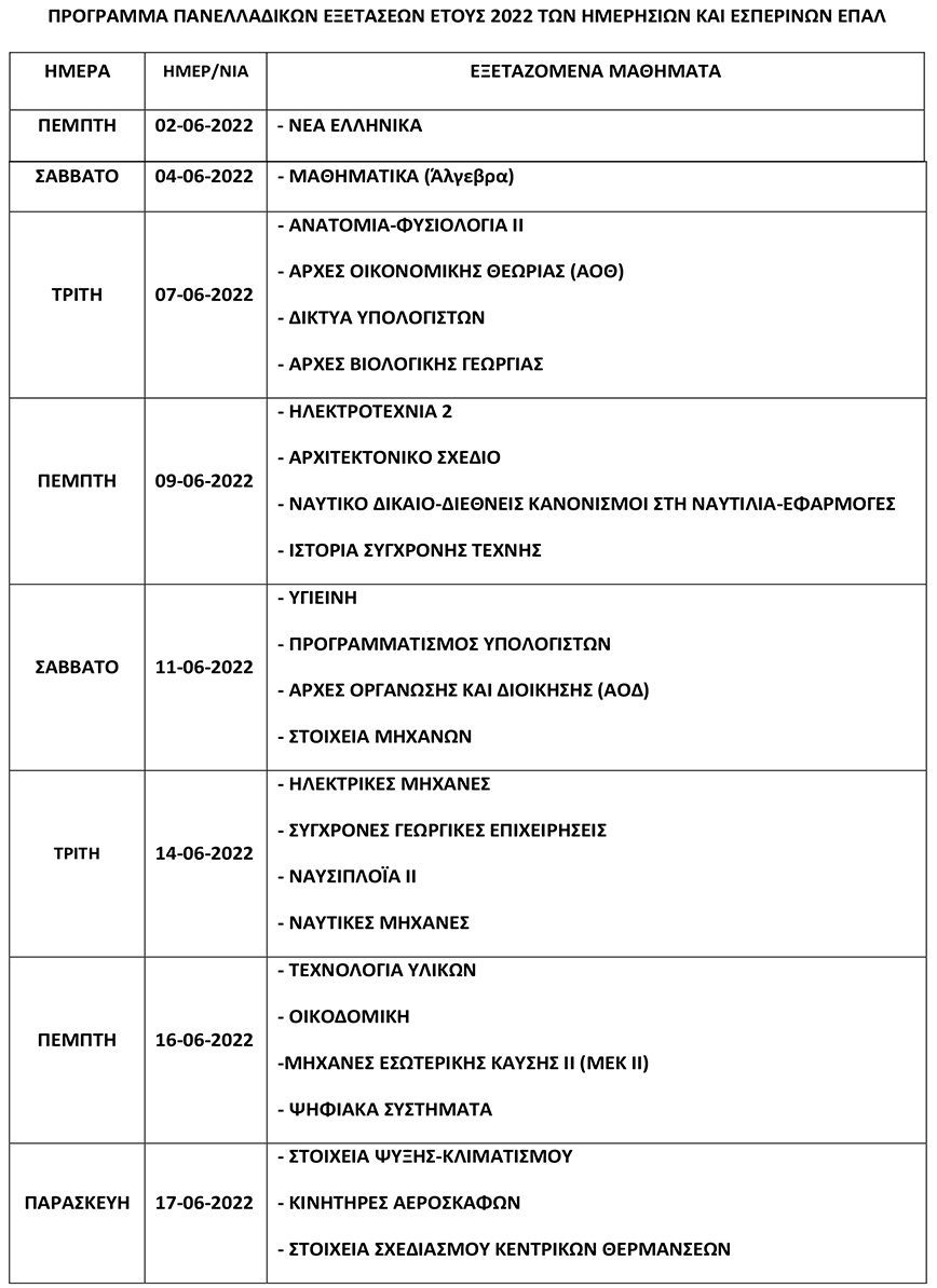 - Έναρξη πανελλαδικών εξετάσεων ημερήσιων και εσπερινών επαγγελματικών λυκείων: 2 Ιουνίου 2022.