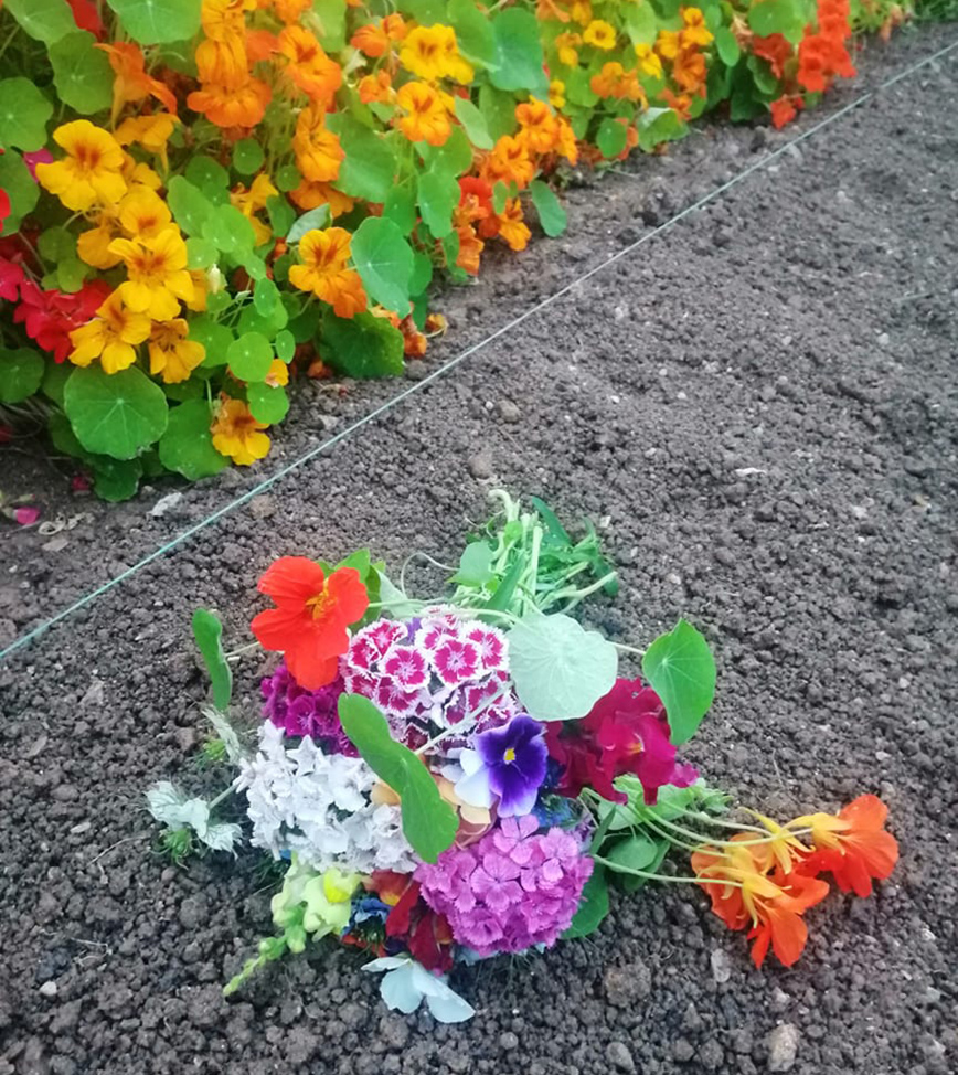 Όπως μάλιστα διευκρινίζει οι βρώσιμες ανθοδέσμες αποτελούνται από -ειδικής κατηγορίας καλλιέργειας- ντάλιες, κενταύρια, χρυσάνθεμα, καλέντουλες, γιασεμί, άλυσσους, φύλλα από πολύχρωμα σέσκουλα και φύλλα από σέλερι, ανθούς από άνιθο, βρώσιμες μαργαρίτες, κινέζικα και ιαπωνικά γαρύφαλλα, μαύρο κύμινο, σκυλάκια, βιόλες και ναστούρτιο, ενώ το φινόκιο, δηλαδή ο μάραθος, θα «ρέει« άφθονος, κυρίως για όγκο.