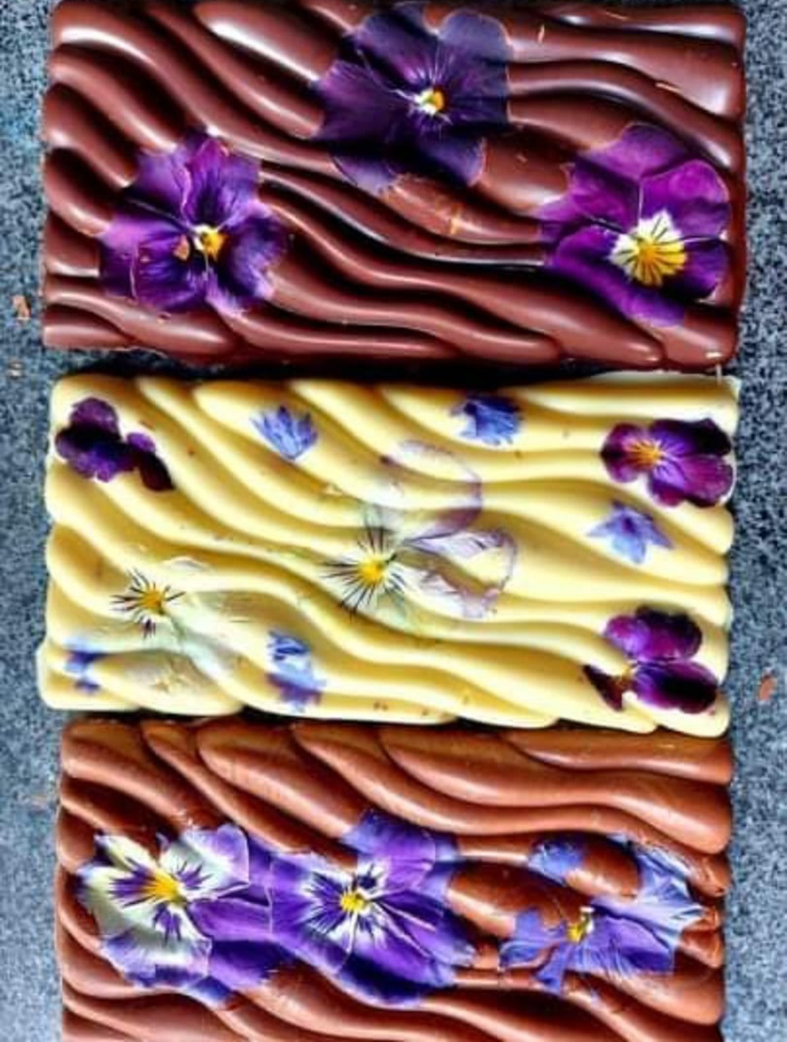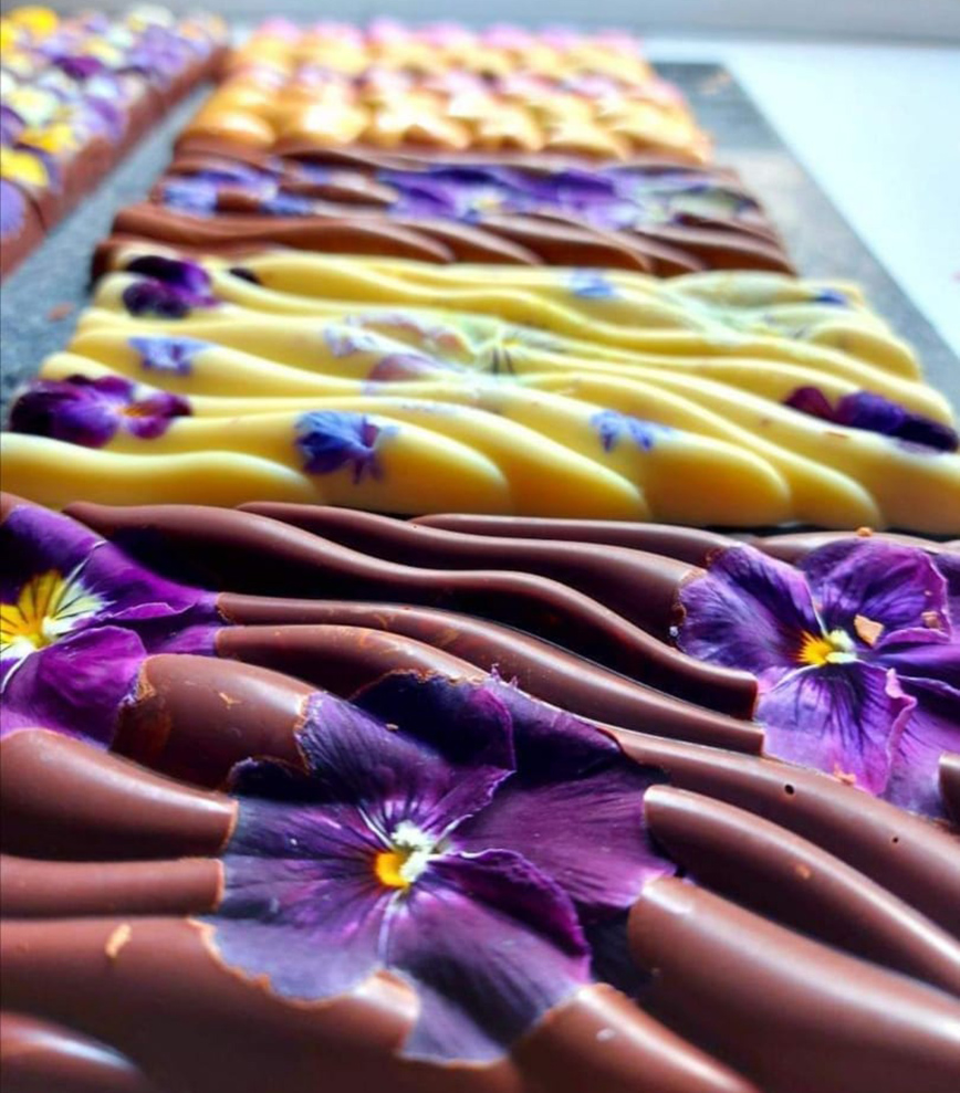 Ανάμεσα στα βρώσιμα λουλούδια τα οποία βρίσκονται κρυμμένα μέσα στις σοκολατένιες δημιουργίες, συμπεριλαμβάνονται σύμφωνα με την Λίλιαν Κουίδου, βιόλες, φλόγες, γκάβρια, γαρύφαλλο, το «λουλούδι της ωραίας Ελένης», το βοράγκιο και το κενταύριο, το βότανο που σύμφωνα με τη μυθολογία που θεράπευσε το κένταυρο Χείρωνα στη μάχη των Τιτάνων όταν τον χτύπησε ο Ηρακλής.