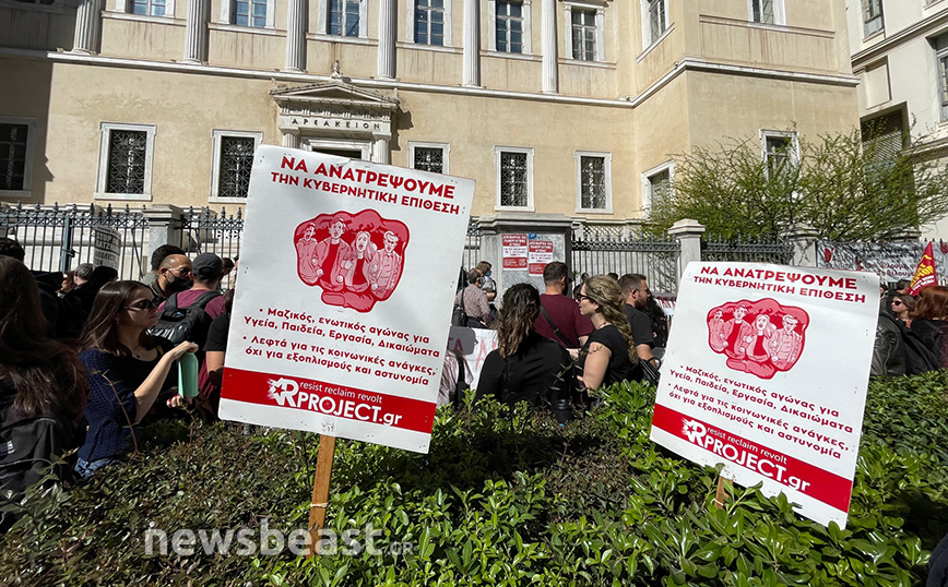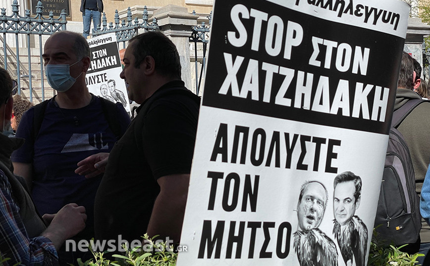 «STOP στον Χατζηδάκη, απολείστε τον Μητσοτάκη» αναφέρουν σε πλακατ τους οι συμμετέχοντες στην κινητοποίηση ενώ ζητούν κατάργηση του νόμου Χατζηδάκη.