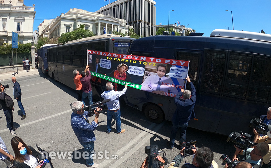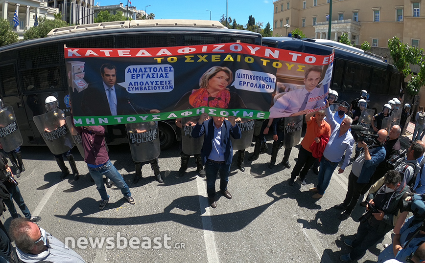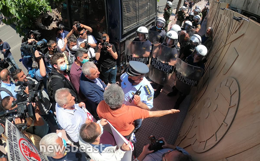 Οι άνδρες της ΕΛ.ΑΣ. δεν άφηναν τα μέλη της ΠΟΕΔΗΝ να κρεμάσουν το πανό τους και αυτοί φώναζαν συνθήματα κατά τους.