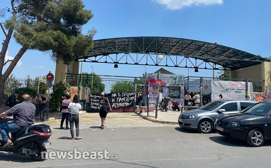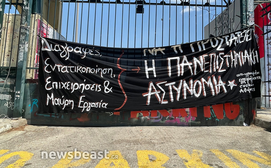 «Να τι προστατεύει η Πανεπιστημιακή Αστυνομία: Διαγραφές, εντατικοποίηση, επιχειρήσεις και μαύρη εργασία» γράφει το πανώ που έχουν κρεμάσει στην πύλη. Σύμφωνα με πληροφορίες του Newsbeast θα γίνει πορεία στους γύρω δρόμους.