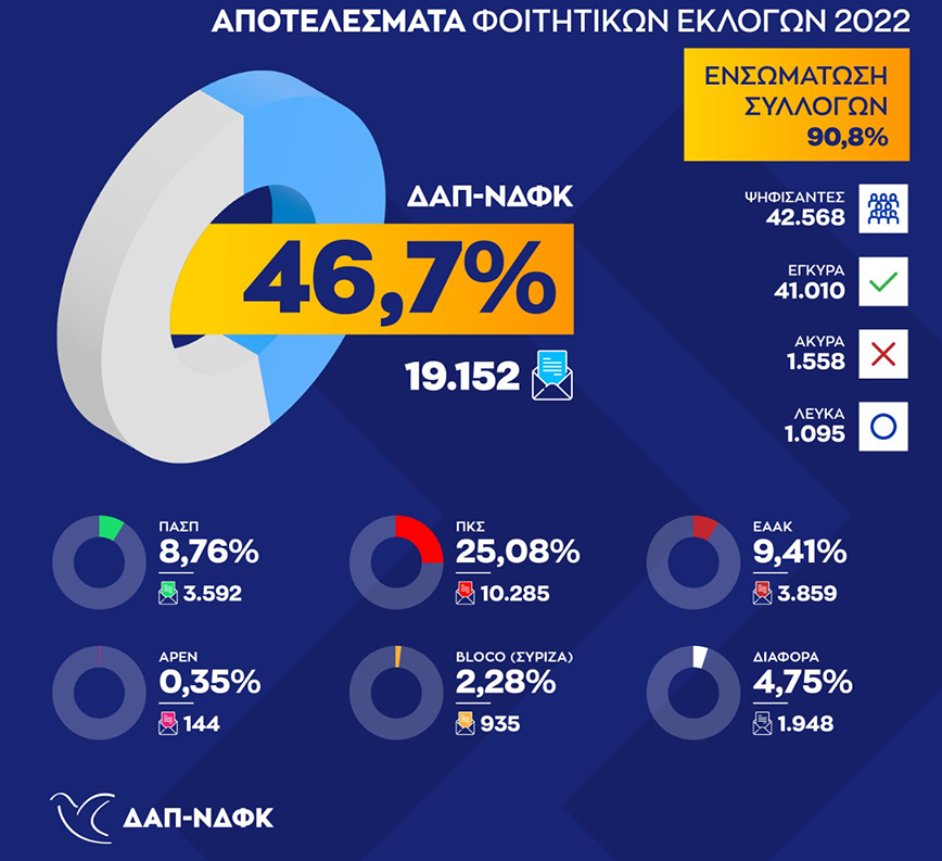 Τη νίκη της με ποσοστό 46,7% ανακοινώνει η ΔΑΠ – ΝΔΦΚ στις χθεσινές φοιτητικές εκλογές με καταγεγραμμένο το 90,8% των συλλόγων, καταλαμβάνοντας την πρώτη θέση στα πανεπιστήμια. Με βάση τις δική της καταμέτρηση, δεύτερη δύναμη αναδεικνύεται η ΠΚΣ με ποσοστό 25,08%, τρίτη η ΕΑΑΚ με ποσοστό 9,41% και ακολουθεί η ΠΑΣΠ με 8,76%, ενώ το BLOCO, τα μέλη του οποίου πρόσκεινται στον ΣΥΡΙΖΑ παίρνουν 2,28 %.