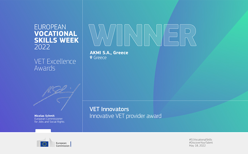 Το ΙΕΚ ΑΚΜΗ ανακηρύχθηκε ως το «Πιο Καινοτόμο ΙΕΚ της Ευρώπης» στα «Βραβεία Αριστείας Επαγγελματικής Εκπαίδευσης & Κατάρτισης 2022». Πρόκειται για την κορυφαία διοργάνωση της Ευρωπαϊκής Επιτροπής που αναδεικνύει και επιβραβεύει τις καλύτερες πρακτικές και τις πιο καινοτόμες εκπαιδευτικές μεθόδους που εφαρμόζονται από τους μεγαλύτερους φορείς Κατάρτισης πανευρωπαϊκά.