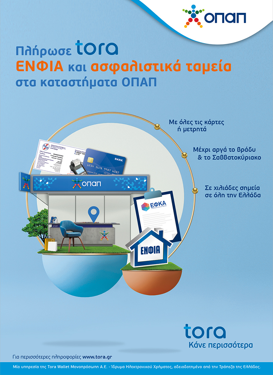 Λίγες ημέρες έχουν απομείνει για την πληρωμή της πρώτης δόσης του ΕΝΦΙΑ, με την προθεσμία να λήγει στις 31 Μαΐου. Τα καταστήματα ΟΠΑΠ προσφέρουν στους φορολογούμενους μια εύκολη λύση για την πληρωμή των δόσεων, μέσω της υπηρεσίας πληρωμών της Tora Wallet. Χωρίς ουρές και αναμονή, οι φορολογούμενοι μπορούν να πληρώσουν τον ΕΝΦΙΑ σε περίπου 3.000 καταστήματα ΟΠΑΠ σε όλη τη χώρα, είτε με χρήση μετρητών είτε μέσω χρεωστικής, πιστωτικής ή προπληρωμένης κάρτας.