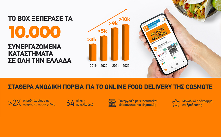 Το BOX, η υπηρεσία food delivery της COSMOTE, μεγαλώνει και επεκτείνεται συνεχώς καταφέρνοντας να φτάσει τα 10.000 συνεργαζόμενα καταστήματα, διαθέσιμα σε 64 πόλειςσε όλη την Ελλάδα, σε μόλις 3 χρόνια λειτουργίας. Ενδεικτικό της δυναμικής του ΒΟΧ, που κάθε χρόνο διπλασιάζει σχεδόν τους χρήστες του, είναι ότι στο ξεκίνημά του συνεργάζονταν με περίπου 3.000 καταστήματα εστίασης, μέσα σε έναν χρόνο αυξήθηκαν στα 5.000 και πέρυσι έφτασαν τα 9.000. Διευρύνοντας ταχύτατα το δίκτυο των συνεργατών του σε νέες περιοχές, με μεγάλες αλυσίδεςεστίασης, δημοφιλή brands και τοπικές επιχειρήσεις, το ΒΟΧ τον τελευταίο χρόνο κατάφερε να υπερδιπλασιάσει τις ημερήσιες παραγγελίες μέσω site/app.