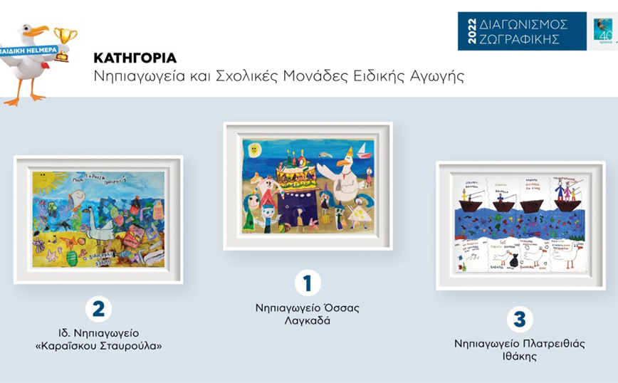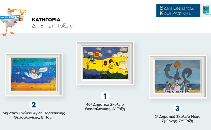 Την ανακοίνωση των αποτελεσμάτων του Πανελλήνιου Διαγωνισμού Ζωγραφικής της Παιδικής HELMEPA με θέμα «Ο δικός μας γλάρος, ο γλάρος της HELMEPA – 40 χρόνια: όχι σκουπίδια, όχι πλαστικά στις θάλασσες και τις ακτές μας», παρακολούθησαν διαδικτυακά (19 Μαΐου 2022) 1.375 παιδιά και 73 εκπαιδευτικοί εθελοντές από Αγία Μαρίνα Κάσου, Αγιά Πρέβεζας, Αγίους Θεοδώρους Κορινθίας, Αλεξανδρούπολη, Αλόννησο, Βασιλικό Ευβοίας, Βόλο, Δάφια Λέσβου, Δερβένι, Ζαγορά Πηλίου, Ηράκλειο Κρήτης, Θεσσαλονίκη, Ιεράπετρα, Κοντοπούλι Λήμνου, Λάρισα, Λύκειο Ρόδοπης, Μεγίστη, Νέα Σμύρνη, Νίκαια, Όσσα Λαγκαδά, Πειραιά, Πετρούπολη, Πλατρειθιά Ιθάκης, Προσοτσάνη Δράμας, Πύργο, Ρόδο, Σαλαμίνα, Σάπες Ροδόπης, Στρογγυλή Κέρκυρας, Τρίπολη, Τυμπάκι Ηρακλείου, Χολαργό, Χρυσούπολη Καβάλας και Ψυχικό.