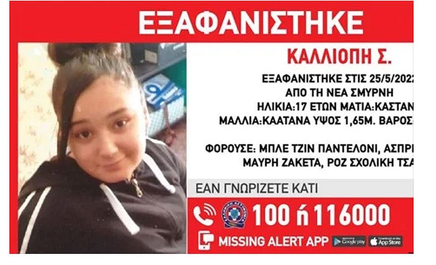Στις 25/05/22, κατά τις απογευματινές ώρες, εξαφανίστηκε από την περιοχή της Ν. Σμύρνης, η Καλλιόπη Σ., 17 ετών. «Το Χαμόγελο Του Παιδιού» ενημερώθηκε σήμερα, 28/05/2022 και άμεσα προέβη στην δημοσιοποίηση των στοιχείων της κατόπιν εισαγγελικής εντολής εκδίδοντας silver alert.