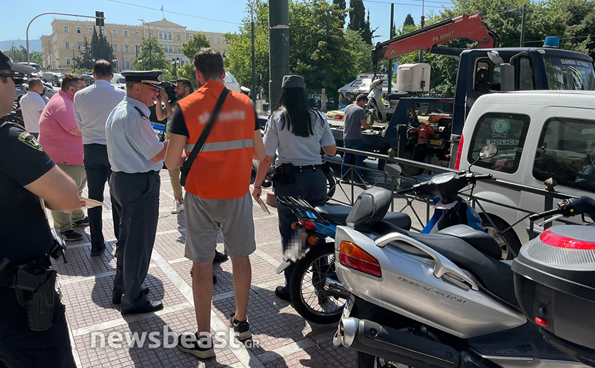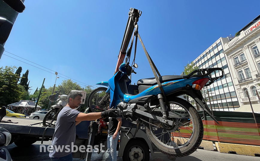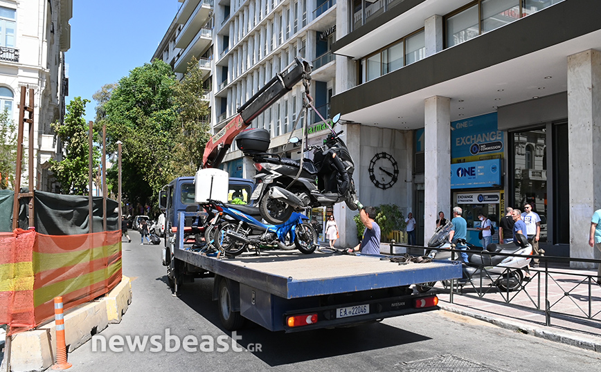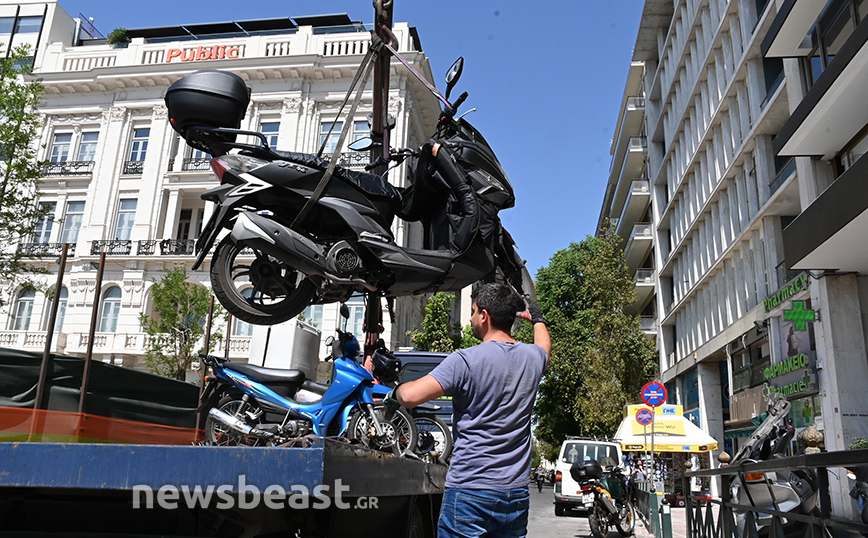 Στις φωτογραφίες που κατέγραψε ο φωτογραφικός φακός του Νewsbeast, διακρίνεται ο γερανός της ΕΛΑΣ να «φορτώνει» μοτοσυκλέτες από την οδό Καραγιώργη Σερβίας, καθώς είχαν σταθμεύσει παράνομα πάνω στο πεζοδρόμιο.