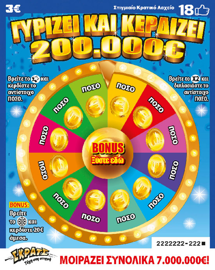 Σχετικά με τον τυχερό λαχνό του ΣΚΡΑΤΣ «Γυρίζει και Κερδίζει», ο κ. Καλπακίδης σημειώνει: «Πρόκειται για ένα από τα πιο διαδεδομένα παιχνίδια του ΣΚΡΑΤΣ. Ο νικητής αγόραζε συχνά λαχνούς από όλα τα παιχνίδια του ΣΚΡΑΤΣ, αλλά είχε μια προτίμηση στο «Γυρίζει και Κερδίζει». Στον τυχερό λαχνό βρήκε το σύμβολο «x2» σε ένα από τα μέρη του τροχού και δίπλα το ποσό των 100.000 ευρώ».
