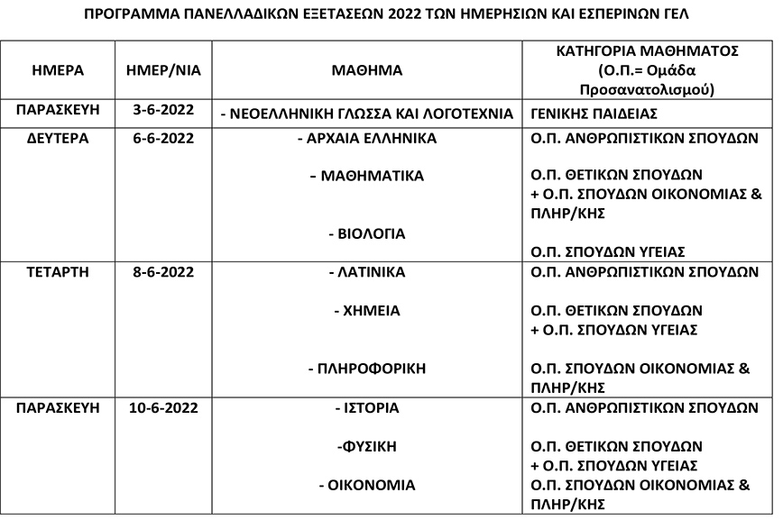 Οι πανελλαδικές ολοκληρώνονται στις 10 Ιουνίου για τους μαθητές των ΓΕΛ και στις 17 Ιουνίου για τους μαθητές των ΕΠΑΛ. Τα Ειδικά Μαθήματα θα εξεταστούν 18-30 Ιουνίου.