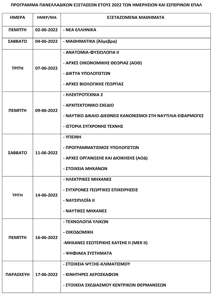 Η εξεταστέα ύλη και τα θέματα των εξετάσεων είναι κοινά για όλους τους υποψηφίους ημερησίων και εσπερινών ΕΠΑΛ.