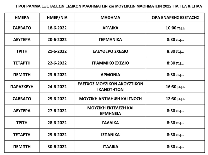- για το μουσικό μάθημα «Μουσική Αντίληψη και Γνώση», η εξέταση στο αντικείμενο της Μουσικής Αντίληψης έχει διάρκεια 30’ λεπτών, ενώ η εξέταση στο αντικείμενο της Μουσικής Γνώσης έχει διάρκεια 2 ωρών.