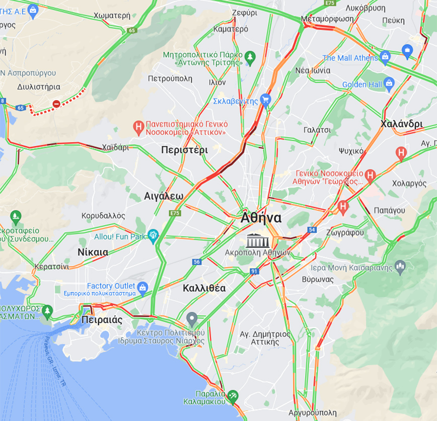 Σύμφωνα με την τελευταία ενημέρωση από την Τροχαία Αττικής, η κίνηση είναι αυξημένη στους εξής δρόμους: