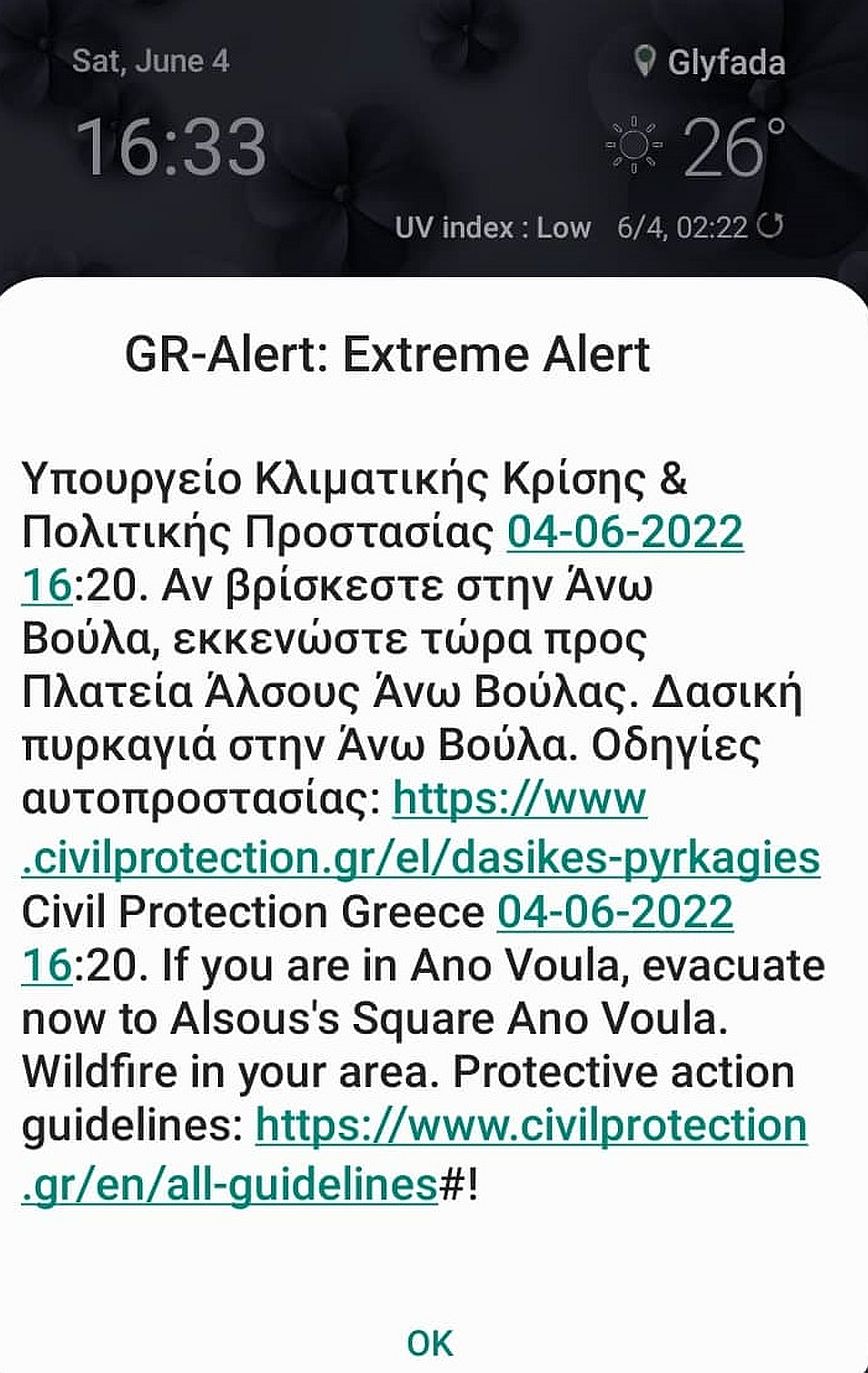 Λίγο μετά τις 16:20 εστάλη στους κατοίκους της περιοχής μήνυμα από το 112. «Αν βρίσκεστε στην Άνω Βούλα, εκκενώστε τώρα προς Πλατεία Άλσους, Άνω Βούλας. Δασική πυρκαγιά στην άνω Βούλα» αναφέρει το μήνυμα που συνέταξε το υπουργείο Κλιματικής Αλλαγής και Πολιτικής Προστασίας.