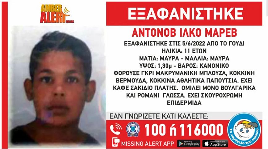 Στις 05/06/22, πρωινές ώρες εξαφανίστηκε από την περιοχή του Γουδί, ο Αντόνοβ (επ.) Ίλκο Μάρεβ (ον.), 11 ετών, βουλγαρικής καταγωγής. Το «Χαμόγελο του Παιδιού» ενημερώθηκε για την εξαφάνιση του ανήλικου και προχώρησε στην ενεργοποίηση του μηχανισμού AMBER ALERT HELLAS κατόπιν εισαγγελικής απόφασης.