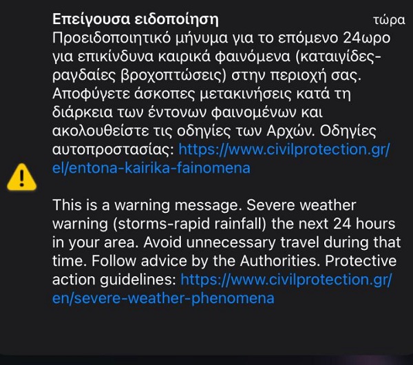 Τα πρώτα μηνύματα από το 112 έχουν σταλεί ήδη στους πολίτες οι οποίοι βρίσκονται στις περιοχές που θα χτυπήσει η κακοκαιρία.
