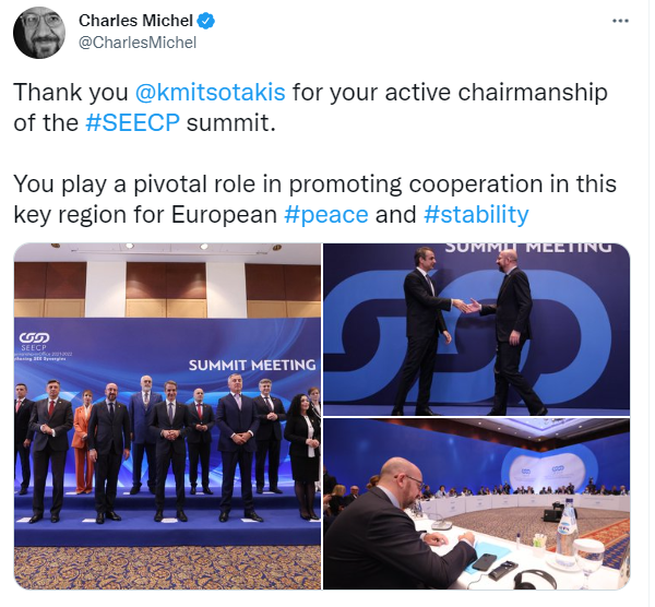Με μήνυμά του στο twitter ο Σαρλ Μισέλ αφού ευχαρίστησε τον πρωθυπουργό στη συνέχεια ανέφερε: «Διαδραματίζετε καθοριστικό ρόλο στην προώθηση της συνεργασίας σε αυτή την περιοχή-κλειδί για την ευρωπαϊκή ειρήνη και σταθερότητα».