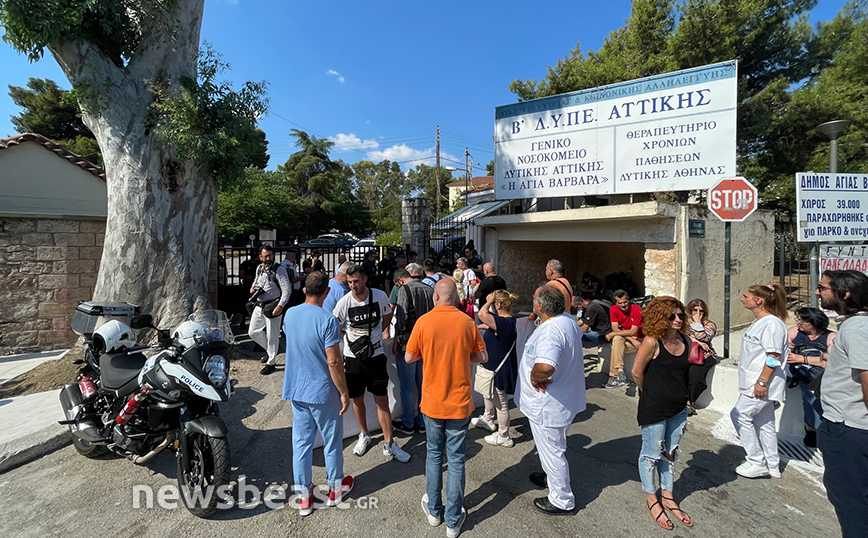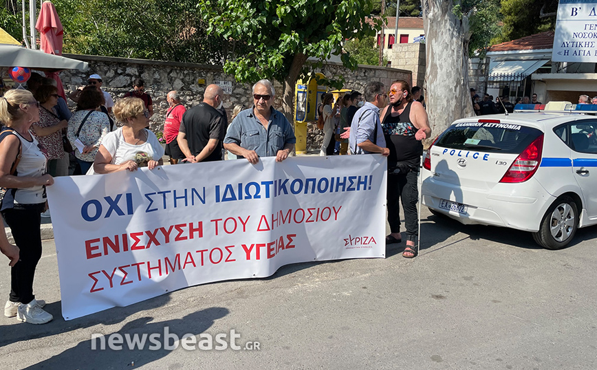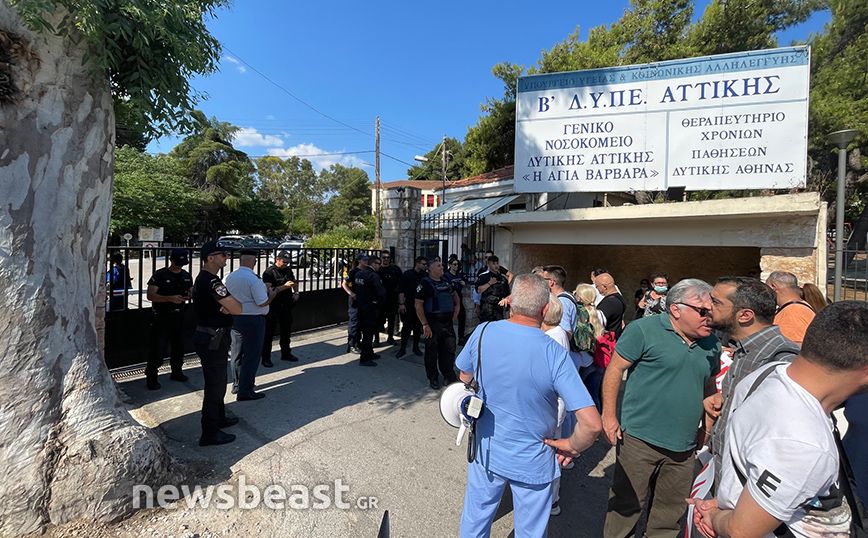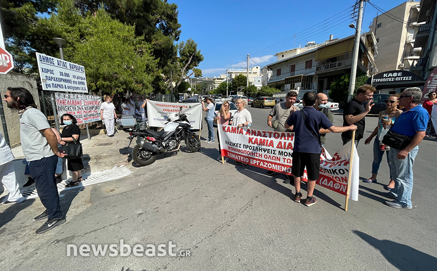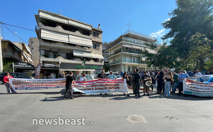 «Το Λοιμωδών να γίνει πάλι πλήρες νοσοκομείο. Διεκδικούμε πανίσχυρο, σύγχρονο, αποκλειστικά δημόσιο δωρεάν σύστημα υγείας» αναγράφεται σε ένα πανό που έχουν αναρτήσει διαδηλωτές έξω από το Γενικό Νοσοκομείο Δυτικής Αττικής «Η Αγία Βαρβάρα».