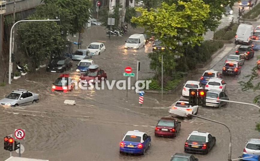 Η οδός Λαγκαδά έχει πλημμυρίσει, τα αυτοκίνητα που κινούνταν σε αυτήν βρίσκονται ακινητοποιημένα με αλάρμ πάνω στο διαχωριστικό διάζωμα.