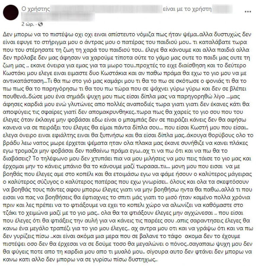 Συγκλονιστική είναι και η νέα ανάρτηση της χήρας του 22χρονου Κώστα, που έπεσε νεκρός από τα πυρά του 44χρονου στο χωριό Αργουλιό του Δήμου Μυλοποτάμου Ρεθύμνου.