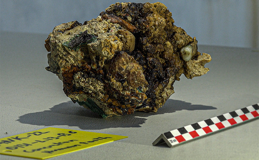 Παρόλα αυτά, η μεγάλη έκπληξη έρχεται από τη ανεύρεση δύο ανθρώπινων δοντιών πάνω σε συμπαγές συσσωμάτωμα με ίχνη χαλκού, το οποίο δια του γενετικού υλικού του θα βοηθήσει στο προσδιορισμό του φύλου και άλλων γενετικών χαρακτηριστικών του ανθρώπου, στον οποίο ανήκαν