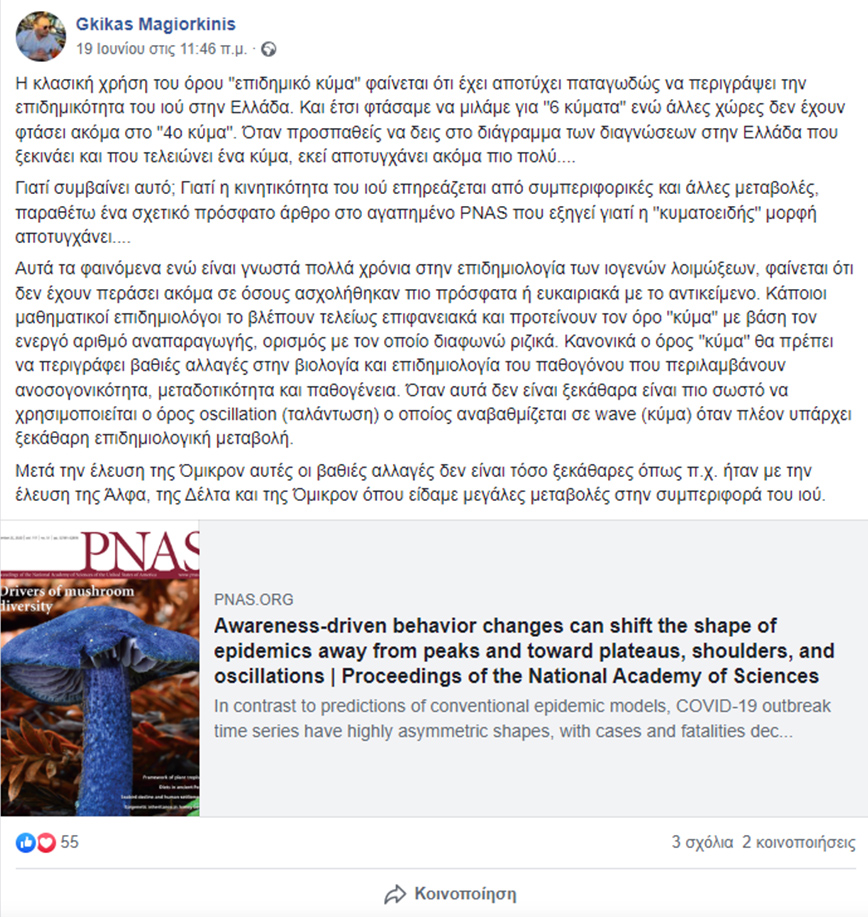 «Η κλασική χρήση του όρου “επιδημικό κύμα” φαίνεται ότι έχει αποτύχει παταγωδώς να περιγράψει την επιδημικότητα του ιού στην Ελλάδα. Και έτσι φτάσαμε να μιλάμε για “6 κύματα” ενώ άλλες χώρες δεν έχουν φτάσει ακόμα στο “4ο κύμα”. Όταν προσπαθείς να δεις στο διάγραμμα των διαγνώσεων στην Ελλάδα που ξεκινάει και που τελειώνει ένα κύμα, εκεί αποτυγχάνει ακόμα πιο πολύ….