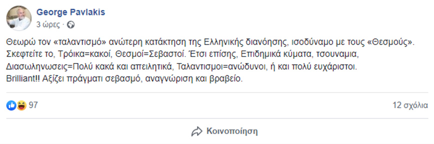 «Θεωρώ τον “ταλαντισμό” ανώτερη κατάκτηση της Ελληνικής διανόησης, ισοδύναμο με τους “Θεσμούς”. Σκεφτείτε το, Τρόικα=κακοί, Θεσμοί=Σεβαστοί. Έτσι επίσης, Επιδημικά κύματα, τσουναμια, Διασωληνωσεις=Πολύ κακά και απειλητικά, Ταλαντισμοι=ανώδυνοι, ή και πολύ ευχάριστοι.