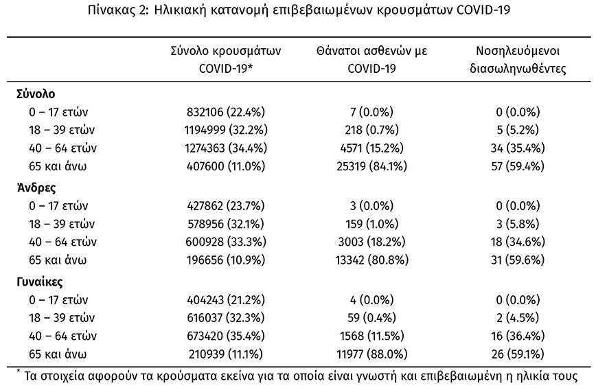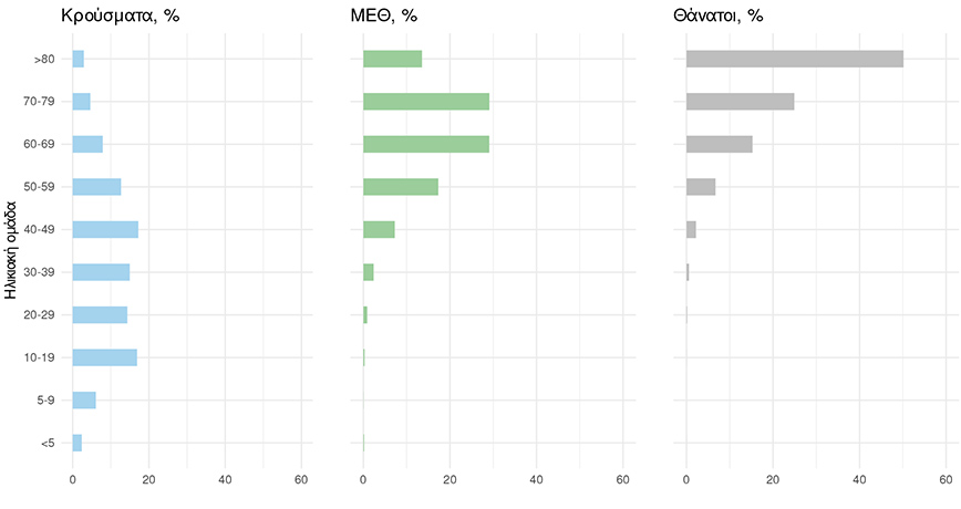 Στον πίνακα παρουσιάζεται η ηλικιακή κατανομή των συνολικών κρουσμάτων, των περιστατικών που κατέληξαν σε θάνατο και των ασθενών που νοσηλεύονται διασωληνωμένοι.
