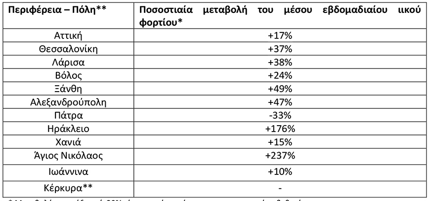 Οριακή ήταν η αυξητική τάση στο Βόλο (+24%), στην Αττική (+17%) και στα Χανιά (+15%). Πτωτική τάση παρατηρήθηκε στην Πάτρα (- 33%). Σταθερό παρέμεινε το ιικό φορτίο στα Ιωάννινα (+10%).