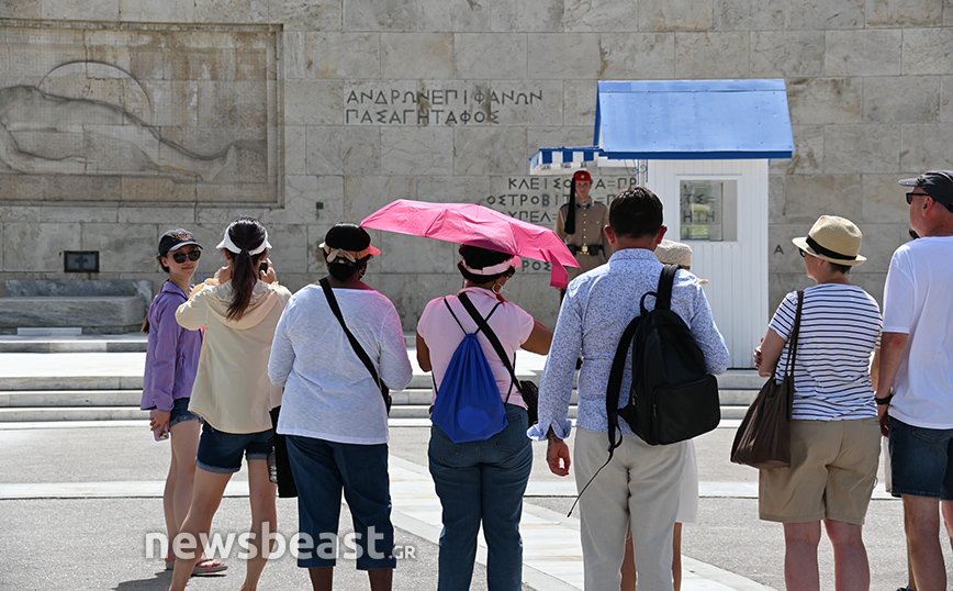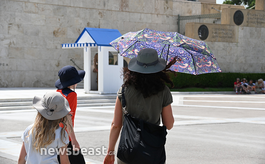 Από το πρωί της Πέμπτης (23/6) τα θερμόμετρα στην Αθήνα δείχνουν 40άρια λόγω του κύματος ζέστης που πλήττει τη χώρα μας. Οι πολίτες που περπατούν στο κέντρο της πρωτεύουσας φορούν καπέλα και κρατούν στα χέρια τους μπουκαλάκια με κρύο νερό ενώ οι Εύζωνες «λιώνουν» μέσα στον παραδοσιακό τους ντουλαμά.