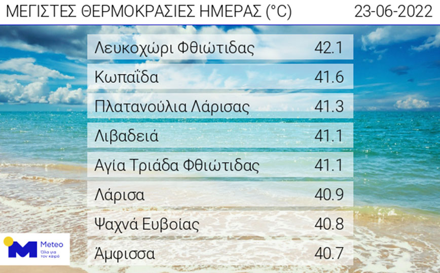 Μάλιστα, σύμφωνα με το Meteo του Εθνικού Αστεροσκοπείου Αθηνών η καταγραφών των σταθμών του δικτύου αυτόματων μετεωρολογικών σταθμών, έδειξε ότι το φράγμα των 40 βαθμών Κελσίου ξεπεράστηκε σε 18 από αυτούς, με την μεγαλύτερη θερμοκρασία να καταγράφεται στο Λευκοχώρι Φθιώτιδας (42,1 βαθμοί Κελσίου).