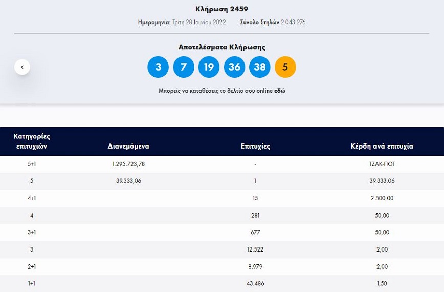Οι τυχεροί αριθμοί λοιπόν, στη σημερινή κλήρωση Τζόκερ είναι οι εξής: 3, 7, 19, 36, 38 και Τζόκερ το 5.
