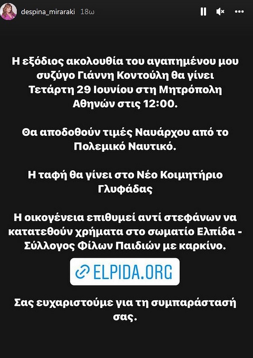 «Η εξόδιος ακολουθία του αγαπημένου μου συζύγου, Γιάννη Κοντούλη θα γίνει Τετάρτη 29 Ιουνίου στη Μητρόπολη Αθηνών στις 12:00. Θα αποδοθούν τιμές Ναυάρχου από το Πολεμικό Ναυτικό. Η ταφή θα γίνει στο νέο κοιμητήριο Γλυφάδας. Η οικογένεια επιθυμεί αντί στεφάνων να κατατεθούν χρήματα στο σωματείο Ελπίδα-Σύλλογος Φίλων Παιδιών με καρκίνο. Σας ευχαριστούμε για τη συμπαράστασή σας» έγραψε σε Insta story η Δέσποινα Μοιραράκη.