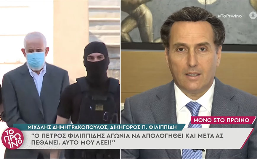 Η αγωνία που έχει ο Πέτρος Φιλιππίδης είναι να μπορέσει να καταφέρει, να είναι ζωντανός και να μπορέσει να απολογηθεί. Η αγωνία του δεν είναι αν θα ζει, η αγωνία του είναι να καταφέρει να απολογηθεί και μετά ας πεθάνει. Αυτό μου λέει» είπε ο Μιχάλης Δημητρακόπουλος.